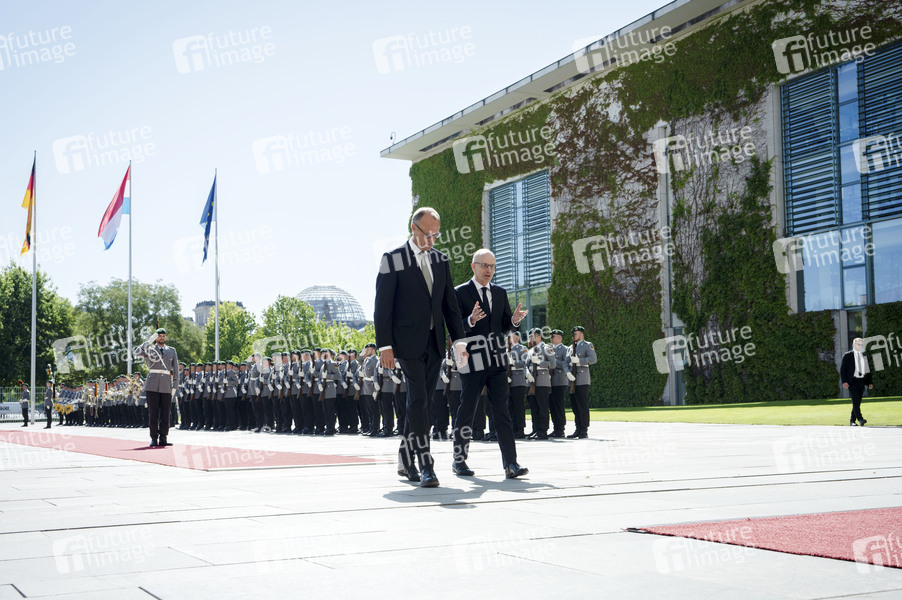 Friedrich Merz und Luc Frieden beim Empfang des Premierministers von Luxemburg mit militärischen Ehren zu einem gemeinsamen Gespräch mit anschließendem Pressestatement im Bundeskanzleramt. Berlin, 01.07.2025