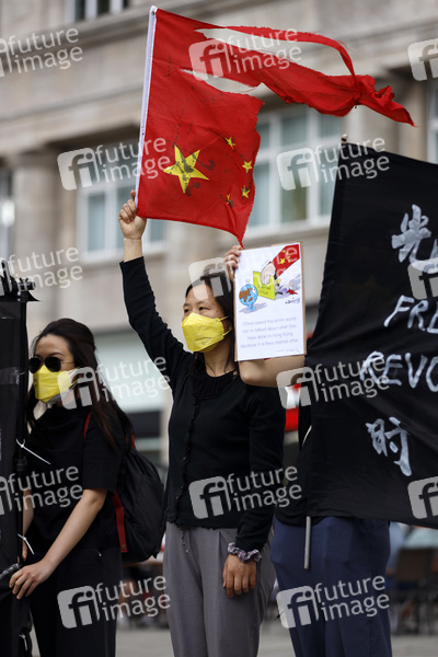 Demonstranten des Vereins 'Hongkonger in Deutschland' protestieren gegen das Vorgehen Chinas gegenüber Hongkong. Nach Ansicht der Aktivisten droht die KPCh die Autonomie der Sonderverwaltungszone Honkkong zu untergraben. Köln, 12.06.2021