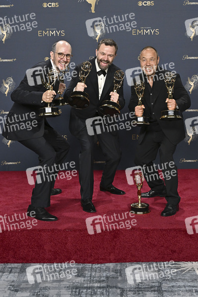 Jack Thorne, Philip Barantini und Stephen Graham mit den Emmys für die beste Mini-Serie 'Adolescence' beim Preisträger-Photocall der 77. Primetime Emmy Awards 2025 im Peacock Theater. Los Angeles, 14.09.2025