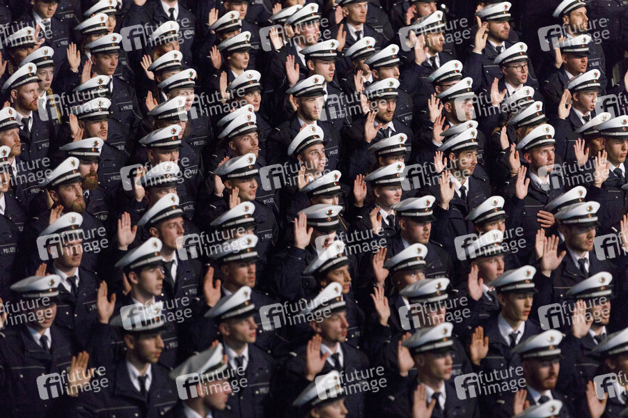 Vereidigung von neuen Kommissaranwärterinnen und Kommissaranwärtern samt traditionellem Mützenwurf in der Lanxess-Arena. Köln, 03.04.2019