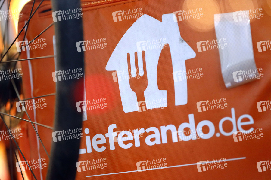 Lieferando, Lieferdienst, Logo, Fahrer, Gehalt, Bezahlung, Radfahren, Fahrrad, Arbeitsbedingungen, Trinkgeld, Essen liefern, Essen bestellen, Essen online, Lieferservice, Dienstleister, Just Eat Takeaway, Essenslieferdienst, Auslieferung, Gastronomie, Essen, Food, Provisionen, Symbolbild, Symbolfoto