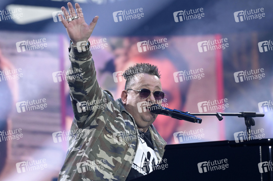 Sebastian Krumbiegel von Die Prinzen live bei der Abschlussveranstaltung auf dem Demokratiefest zu 75 Jahren Grundgesetz auf der Bühne zwischen Kanzleramt und dem Deutschen Bundestag. Berlin, 26.05.2024