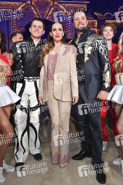 Alexis Lacey, Jana Mandana Lacey-Krone und Martin Lacey jr. bei der Premiere des Circus Krone Tourneeprogramms 'Farbenspiel - Gold Edition' im Circus Krone Zelt auf der Theresienwiese. München, 10.04.2025