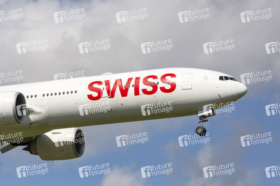 Boeing 777-3DEER, Reg: HB-JNH beim Anflug zum Flughafen Zürich, 15.08.2019