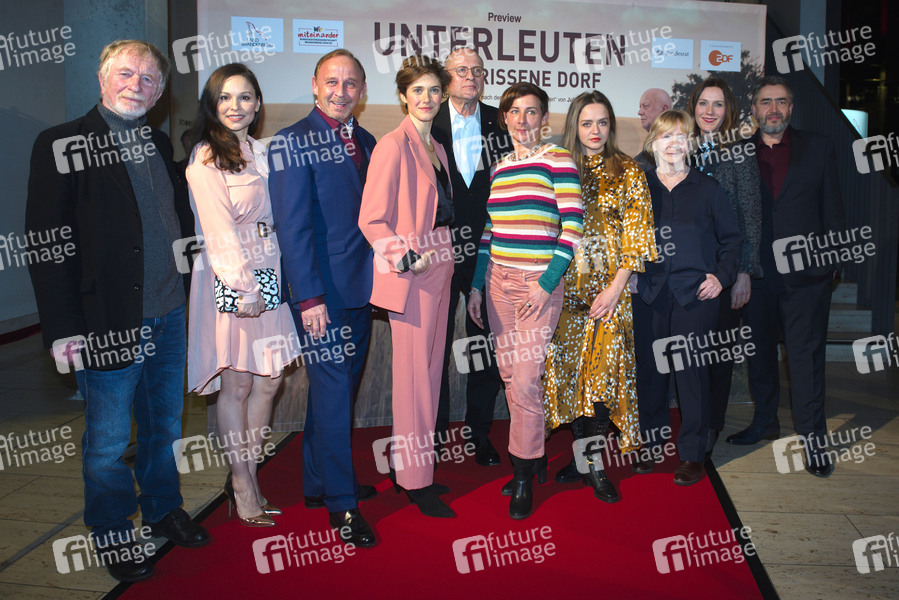 Hermann Beyer, Mina Tander, Alexander Held, Miriam Stein, Sarina Radomski, Christine Schorn, Dietmar Woidke, Bettina Lamprecht und Alexander Hörbe bei der Preview des ZDF TV-Dreiteilers 'Unterleuten - Das zerrissene Dorf' in der Vertretung des Landes Brandenburg. Berlin, 18.02.2020