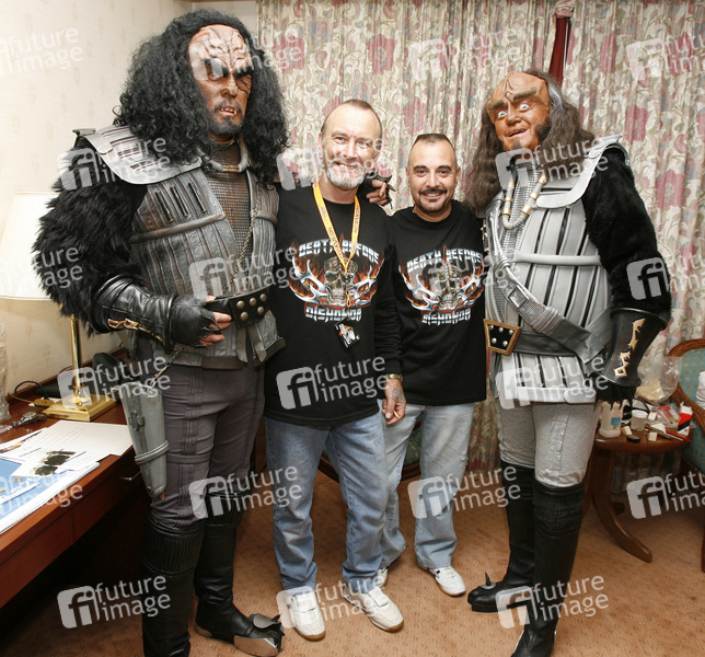 J.G. Hertzler und Robert O'Reilly mit Maskenbildner Stewart Lucas und Keith Batt vom britischen Klingonen-Club 'Imperial Klingon Expeditionary Forces'