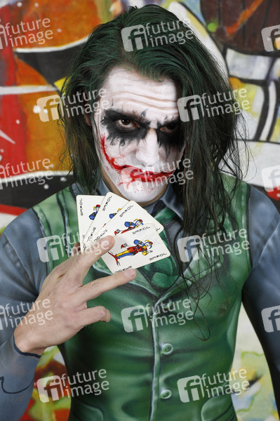 Cosplay, Cosplayer, Bodypainting, Body-Painting, Make-up, Maskenbildnerei, Körperkunst, Körperfarben, Projekt Farbkörper, Farbe, Bemalung, Kunst, Malerei, Comic, DC Comics, Comicfigur, Verbrecher, Psychopath, Batman-Gegner, body painting, body art, project color body, colors, colours, villain, comic character, criminal, psychopath, Batman opponent, Spielkarte, Spielkarten, playing card