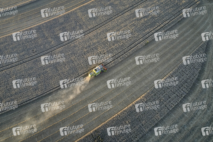 Luftbild, Luftaufnahme, Mähdrescher, Erntemaschine, Korn, Kornfeld, Vollkorn, Ähren, Halme, Feld, Landwirtschaft, Dürre, Trockenheit, Wasser, Regen, Grundwasser, Wasserknappheit, Grundwasserspiegel, Grundwasserpegel, Trockenphase, Ernte, Ernten, Getreide, Landwirte, Bauern, Acker, Äcker, Weizen, Gerste, Roggen, Wheat, Rye, Barley, Körner, Triticale, Anbau, Bio, Dünger, Agrar, Agrarwirtschaft, Erntewetter, Ernteausfall, Ernteausfälle, Futterkrise, Missernte, Futter, Saat, Saatgut, Anbau, Fruchtbarkeit, Bauern, Bauernverband, Symbolbild, Symbolfoto