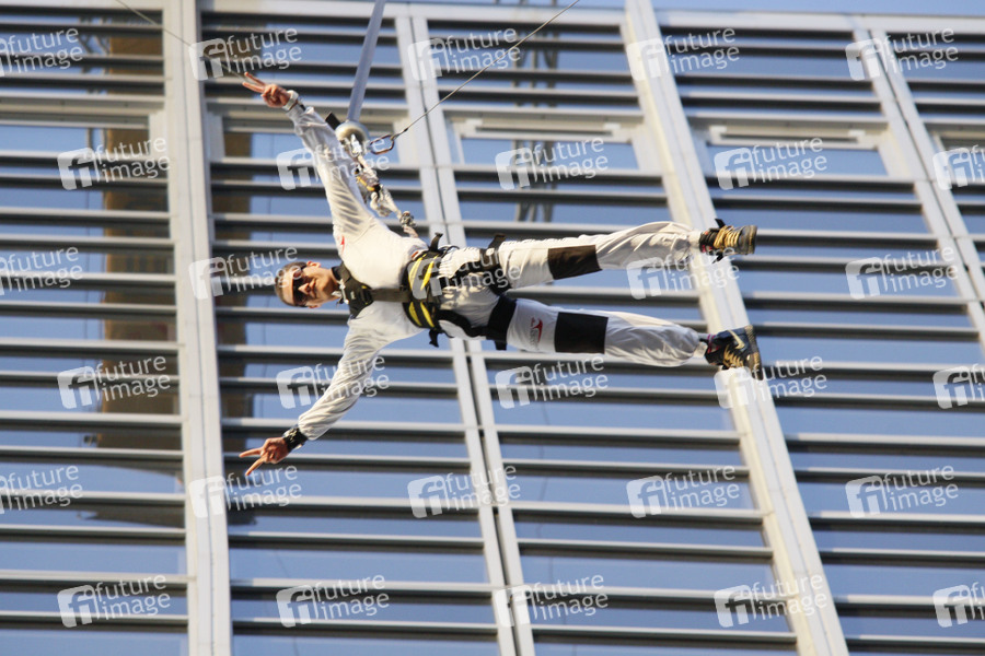 Base Flying von Jochen Schweizer mit den Hauptdarstellern von 'Gangs' auf dem Park Inn Hotel am Alexanderplatz in Berlin