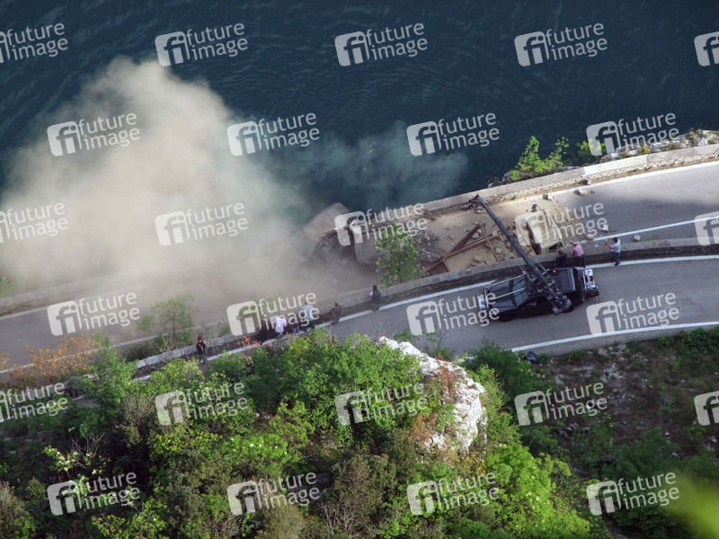 Zwei Stuntmen verletzten sich am Mittwoch, als sie mit dem Auto zunächst gegen einen weiteren Wagen und dann gegen eine Mauer prallten. Der Unfall ereignete sich am Drehort auf der Uferstraße des Gardasees, östliches Ufer, zwischen Limone sul Garda und Campione del Garda, auf Höhe der Ortschaft Pieve de Tremosine