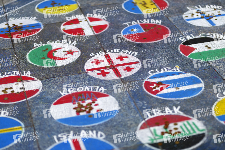 Werk einen Straßenkünstlers, bei dem die Passanten Geld auf die von ihnen bevorzugte Länderflagge legen können. Köln, 11.11.2019