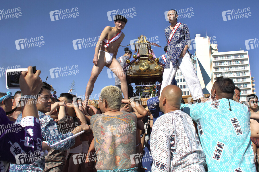 Teilnehmer auf einem tragbaren Schrein während einer Reinigungszeremonie am Strand Katase Higashihama. Fujisawa, 18.01.2026