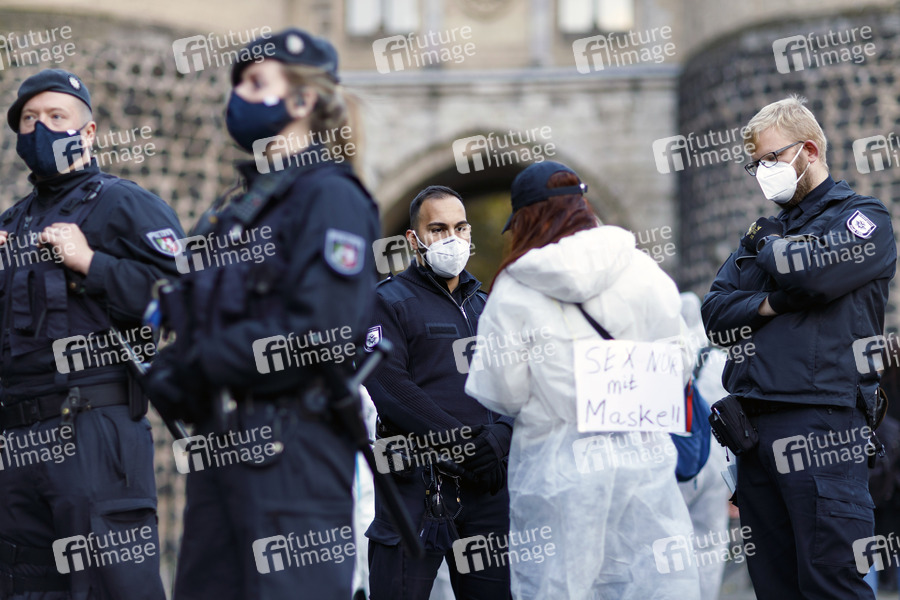 Polizisten und Mitarbeiter des Ordnungsamtes müssen im Dienst auf Demos eine Maske tragen - hier auf einer Demonstration gegen die Corona-Maßnahmen von Stadt Köln und Bundesregierung auf dem Rudolfplatz. Köln, 31.10.2020