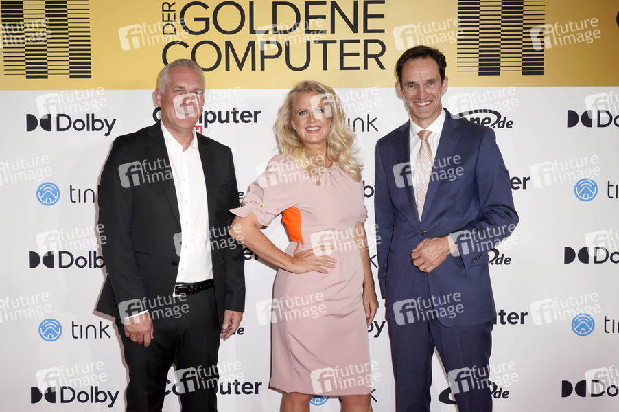 Dirk General-Kuchel, Barbara Schöneberger und Frank Mahlberg bei der Verleihung 'Der Goldene Computer' 2022 im Axel Springer SE Verlag. Berlin, 31.08.2022