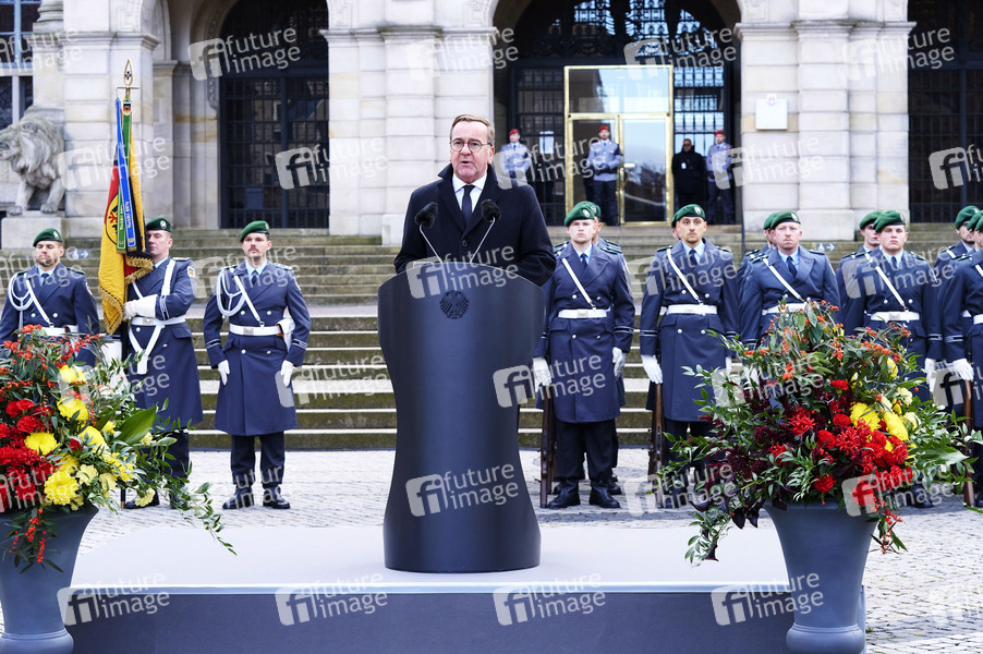 Boris Pistorius beim Feierlichen Gelöbnis zum Gründungstag der Bundeswehr auf dem Platz der Menschenrechte vor dem Neuen Rathaus. Hannover, 12.11.2024