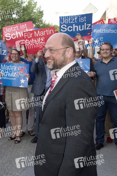 Martin Schulz mit seinen Anhängern vor der Telekom Hauptstadtrepräsentanz, in der die TV-Talksendung 'Wie geht´s, Europa?' mit Maybrit Illner und Mitri Sirin stattfindet. Berlin, 22.05.2014