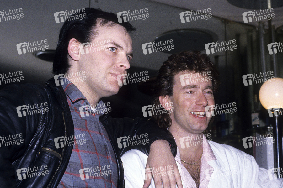Gary Numan und Bill Sharpe bei einer Pressekonferenz in einem Hotel. London, 15.03.1985