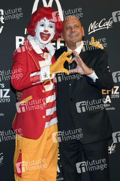 Ronald McDonald und Holger Beeck bei der 16. McDonald's Benefiz Gala 2019 im Hotel Bayerischer Hof. München, 09.11.2019