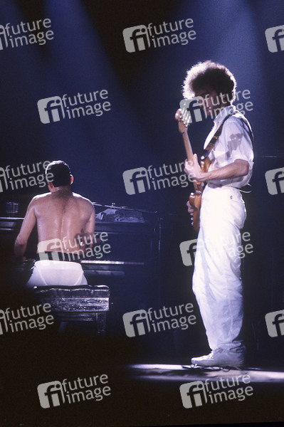 Freddie Mercury und John Deacon von Queen live bei einem Konzert der 'Works'-Tour in der Wembley Arena. London, 07.09.1984