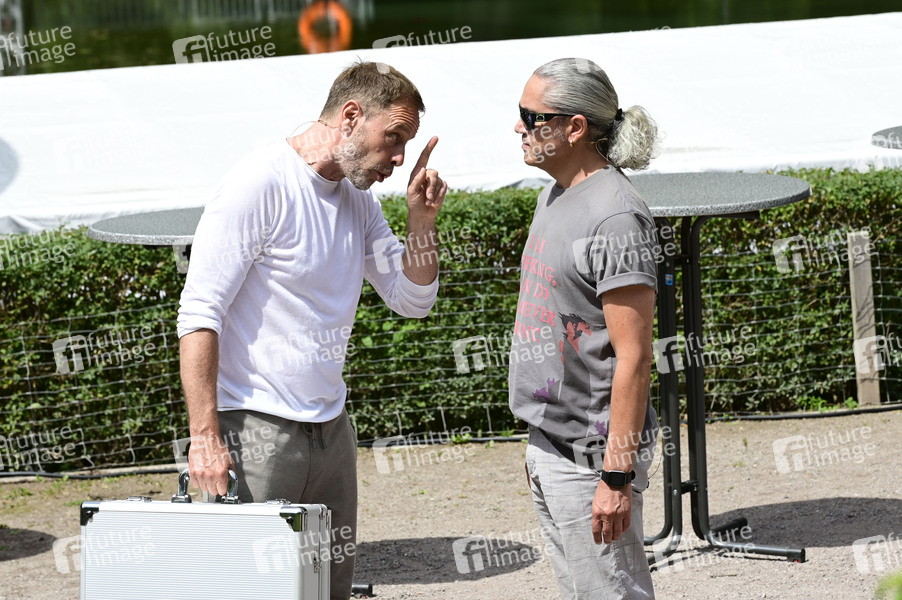 Julian Weigend und Marco Marcu bei der Fotoprobe zum Theaterstück 'Jedermann' am Pavillon im Weimarhallenpark. Weimar, 10.07.2024