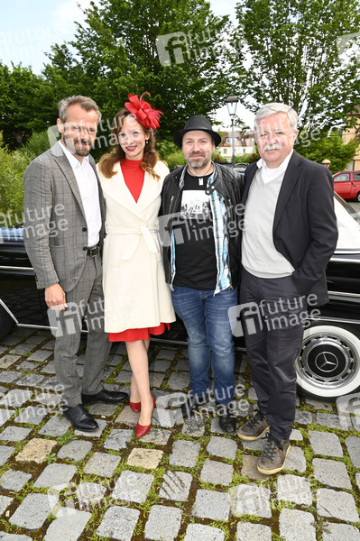 Sven Waasner, Viola Wedekind, Adam Jaskolka und Alexander Ollig bei der 4. Sternstunden Benefiz Oldtimer Rallye 2022 für geflüchtete Kinder aus der Ukraine (Spendensumme über 12.000 Euro) am Start & Ziel auf dem Kornhausplatz. Spalt, 29.05.2022