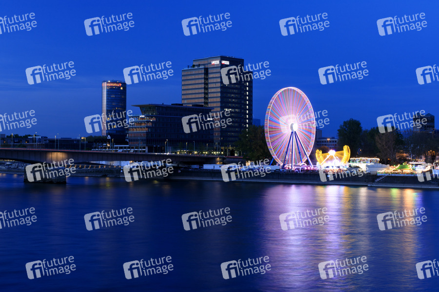 Kirmes, Lichter, Freizeit, Rummel, Volksfest, Unterhaltung, Rummelplatz, Jahrmarkt, Fahrgeschäft, Vergnügen, Looping, Vergnügung, Vergnügungsfahrgeschäft, Vergnügungssteuer, Achterbahn, Rollercoaster, Frühlingsfest, Fahrgeschäft, Fliehkräfte, Fliehkraft, Karussell, Riesenrad, Rheinufer, Chemiekonzern, Energizing Chemistry, Lanxess Tower, Lanxess-Hauptsitz, Fliehkräfte, G-Kräfte, G-Force, Höhenangst, Beschleunigung, Fliehkraft, Lanxess-Zentrale, Symbolbild, Symbolfoto