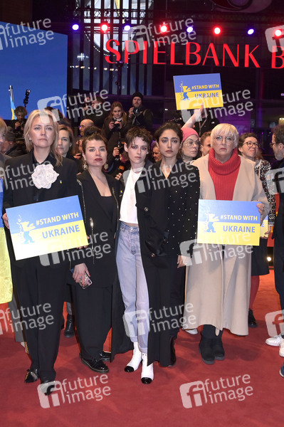 Kristen Stewart, Golshifteh Farahani und Claudia Roth demonstrieren zusammen mit ukrainischen Filmemachern und Mitgliedern der Intarnationalen Jury ihre Solidarität mit der Ukraine auf dem Roten Teppich vor dem Berlinale-Palast auf der Berlinale 2023 / 73. Internationale Filmfestspiele Berlin. Berlin, 24.02.2023