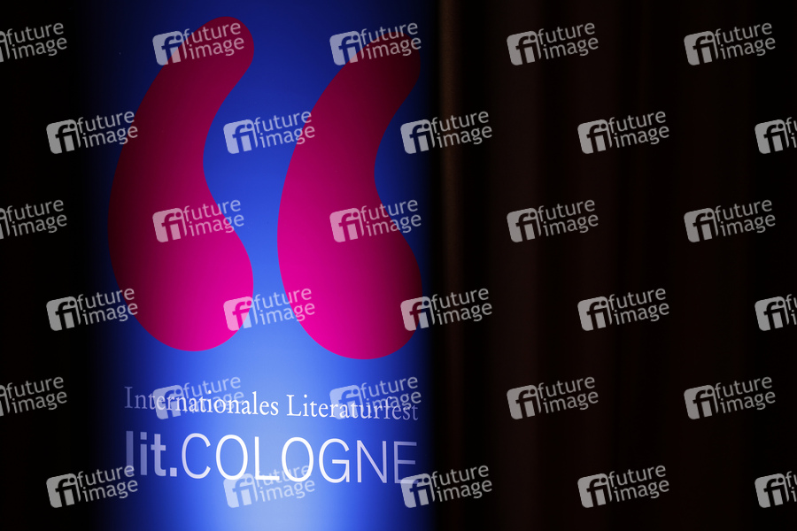 Das Logo des Literaturfestivals lit.Cologne auf einem Aufsteller bei der lit.Cologne Sonderedition Veranstaltung 'Herta Müller findet: Heimweh ist keine gute Idee' in der Stadthalle in Köln Mülheim. Köln, 28.10.2021