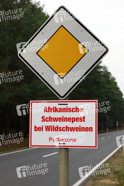 Medizin, Gesundheit, Tierseuche, ASP, Gesundheit, Tiere, Wildschweine, MED, Schweinepest, Afrikanische Schweinepest, Schriftzug, Seuche, Schild, Wildschweinepest, Schweinepestverordnung, Hinweisschild, Warnung, Grenzgebiet, Symbolfoto, Symbolbild