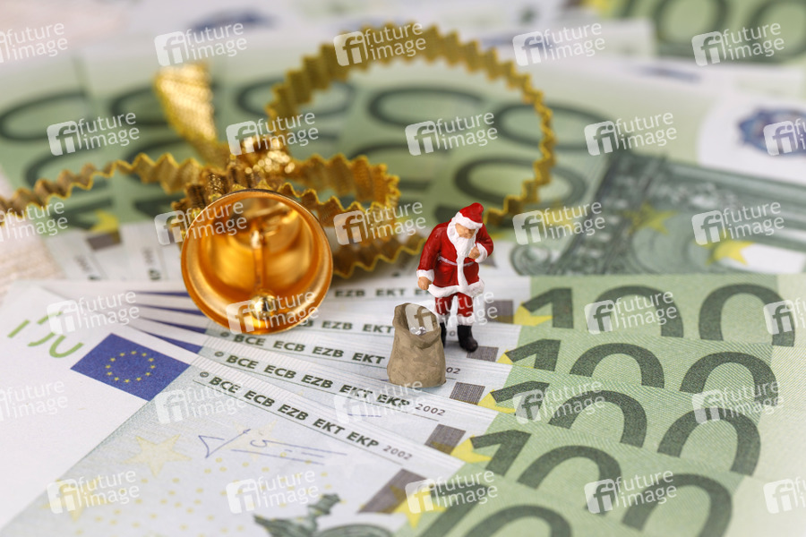 Ein Weihnachstmann mit Gabensack steht auf mehreren Geldscheinen, auf denen auch ein Glöckchen liegt. (Themenbild, Symbolbild) Köln, 12.12.2020