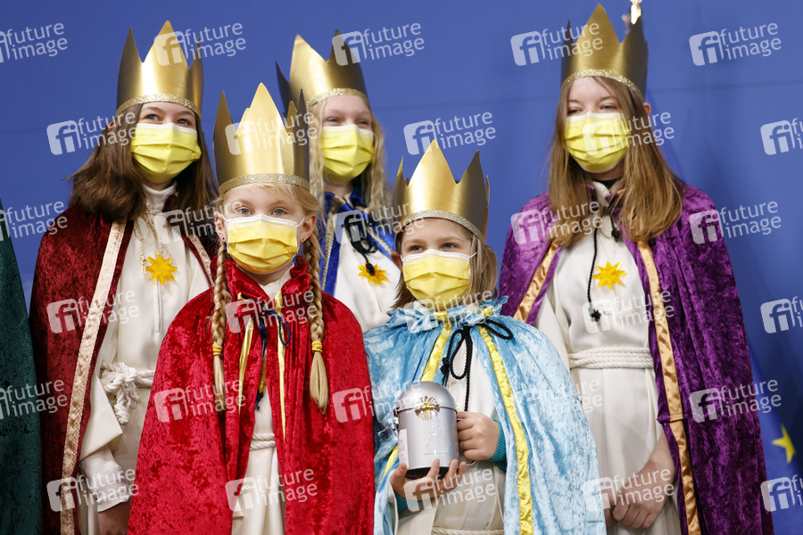 Fototermin, Sternsinger, Sternsingen 2022, Kirche, Glaube, Segen, Erzbistum Köln, Dreikönigssingen, Heilige Drei Könige, Caspar, Melchior, Balthasar, CMB, Diözese Aachen, römisch-katholische Kirche, Dreikönigstag, Brauch, Brauchtum, Tradition, Carol Singers, Masken, Corona, Maskenpflicht, Schutz, OP-Maske