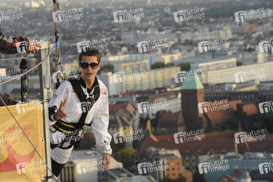 Base Flying von Jochen Schweizer mit den Hauptdarstellern von 'Gangs' auf dem Park Inn Hotel am Alexanderplatz in Berlin