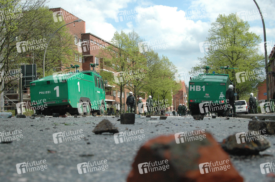 Politik, Tag der Arbeit, 1. Mai, Polizei, Wasserwerfer, Polizisten, Polizei, Demonstranten, Demonstration, Steine, Pflastersteine