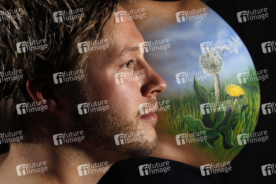 Bodypainting, Erotik, Frau, Mann, fast nackt, drinnen, weiblich, männlich, Körperkunst, Kunst, Malerei, Paar, schwanger, Bauch, Frühling, erotic, woman, man, nude, indoor, female, body art, body painting, pregnant, couple, spring