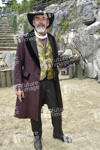 Prominenz, Fotoprobe, Fototermin, Pressetermin, Photocall, Fotocall, PK, Unterhaltung, Entertainment, Kultur, Western, Freilichtbühne, Kalkbergstadion, Open Air Theater, 69. Karl-May-Spiele 2022, Tier, Vogel, Falke, Schauspieler