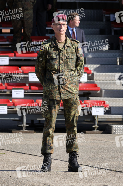 Brigadegeneral Jens Arlt bei einem Appell für die Soldatinnen und Soldaten der Evakuierungsmission in Kabul und dem Feierlichen Gelöbnis von Rekruten des Fallschirmjägerregiments 31 in der Fallschirmjägerkaserne Seedorf. Seedorf, 22.09.2021