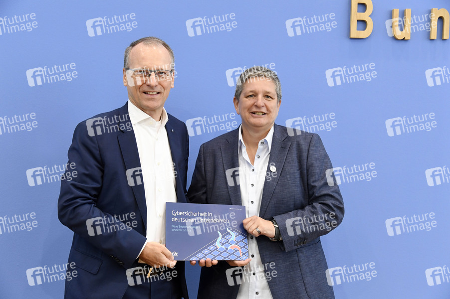Michael Fübi und Claudia Plattner bei der Bundespressekonferenz 'Cybersecurity: Studie zur digitalen Sicherheit der deutschen Wirtschaft vor dem Hintergrund globaler Krisen' im Haus der Bundespressekonferenz. Berlin, 11.06.2025