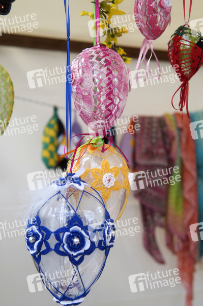 Umhäkelte Klarsichteier. Das Gelbe vom Ei - kunsthandwerklicher Ostermarkt auf dem Karl-August-Platz in Charlottenburg (Symbolfoto, Themenfoto). Berlin, 24.03.2024