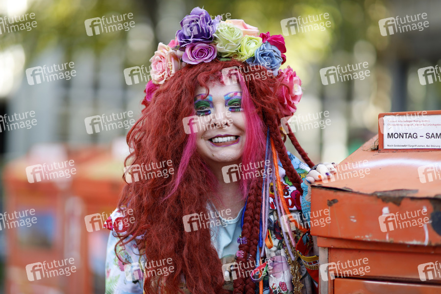 Elke Koska, ehemalige Muse von HA Schult, bei der Präsentation seiner Installation 'Tableau des Vergessens' aus alten Bild-Verkaufskästen auf dem Börsenplatz. Köln, 10.09.2020