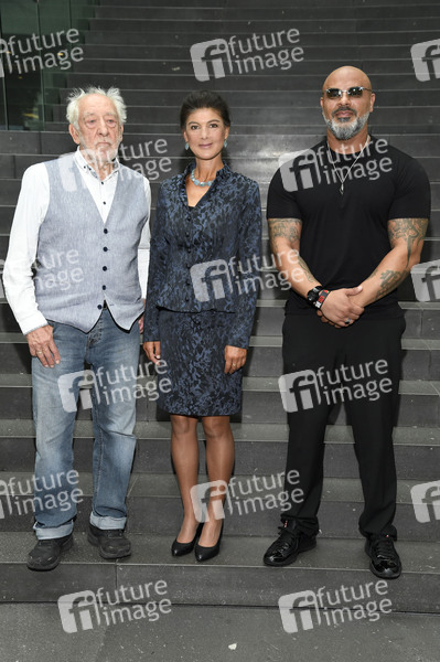 Dieter Hallervorden, Sahra Wagenknecht und Massiv bei der Pressekonferenz zur Friedenskundgebung am 13. September im Tagungszentrum im Haus der Bundespressekonferenz. Berlin, 08.09.2025
