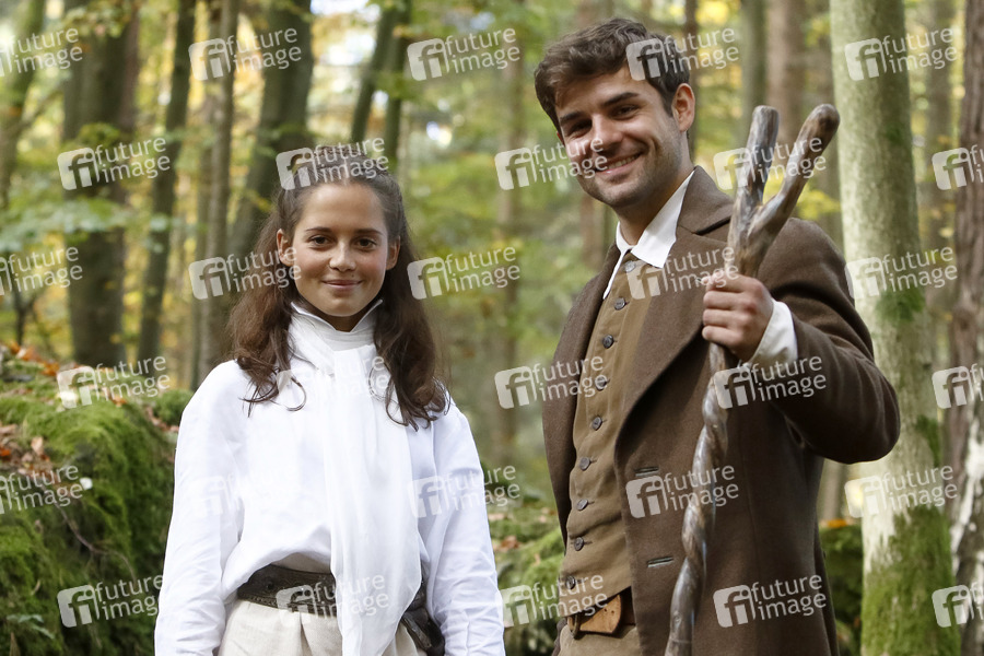 Bianca Nawrath und Lucas Reiber beim Fototermin am Set des Märchenfilms 'Der starke Hans' aus der ARD-Reihe 'Sechs auf einen Streich' im Druidenhain. Muggendorf, 17.10.2019