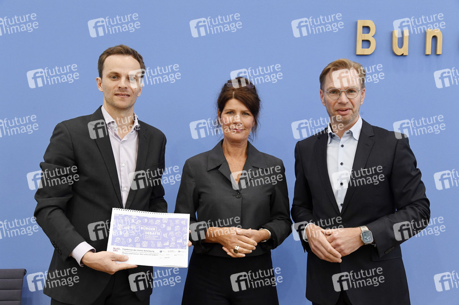 Christoph Trautvetter, Claudine Nierth und Reiner Holznagel bei der Bundespressekonferenz 'Ergebnisse zur Bürgerdebatte gerechte Steuern und Finanzen' im Haus der Bundespressekonferenz. Berlin, 26.05.2025