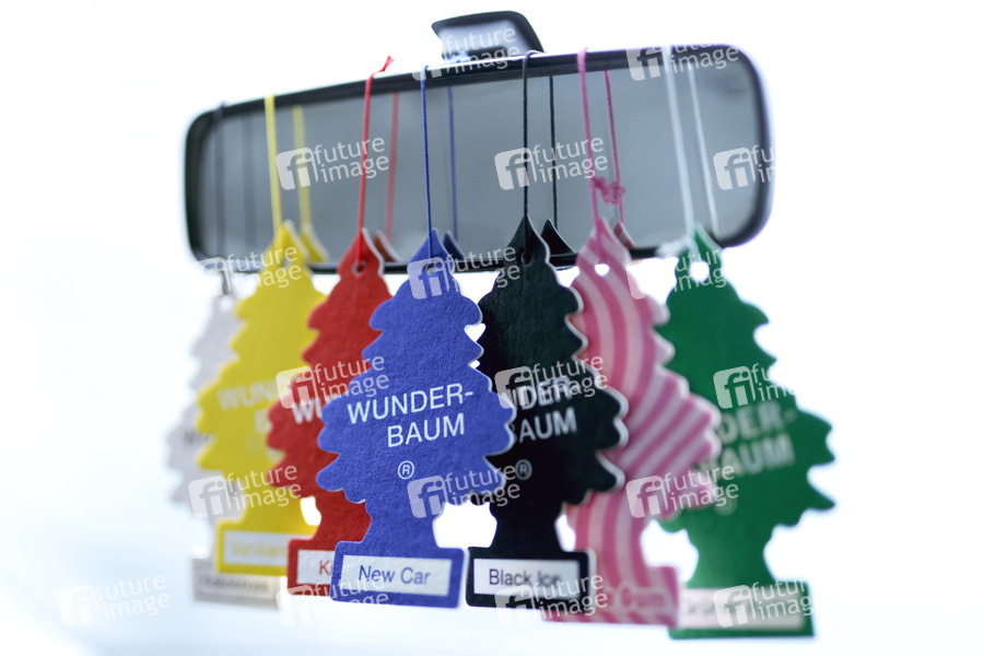 Wunderbaum, Wunderbäume, Wunder-Baum, Wunder-Bäume, Auto-Duft, Auto-Luft, Auto-Lufterfrischer, Dufterfrischer, Lufterfrischer, Geruch, Geruchsneutralisierung, Duft, Autozubehör, Auto-Zubehör, Rückspiegel, Fahrzeuginnenraum, Duftspender, New Car, Black Ice, Bubble Gum, Grüner Apfel, Kokosnuss, Kirsche, Vanillearoma, Aroma, Augenreizung, Car-Freshner, Duftstoffe, Duftbaum, Duftbäumchen, Reizüberflutung, Riechen, Teil der Populärkultur, Symbolbild, Symbolfoto