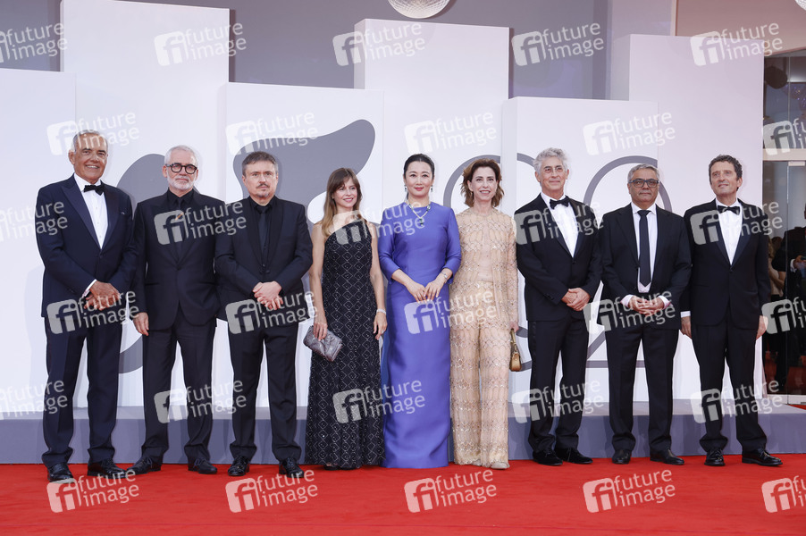 Alberto Barbera, Stephane Brize, Cristian Mungiu, Maura Delpero, Zhao Tao, Fernanda Torres, Alexander Payne, Mohammad Rasoulof und Pietrangelo Buttafuoco bei der Opening Ceremony mit der Premiere des Kinofilms 'La Grazia / Grace' auf der Biennale di Venezia 2025 / 82. Internationale Filmfestspiele von Venedig im Palazzo del Cinema. Venedig, 27.08.2025