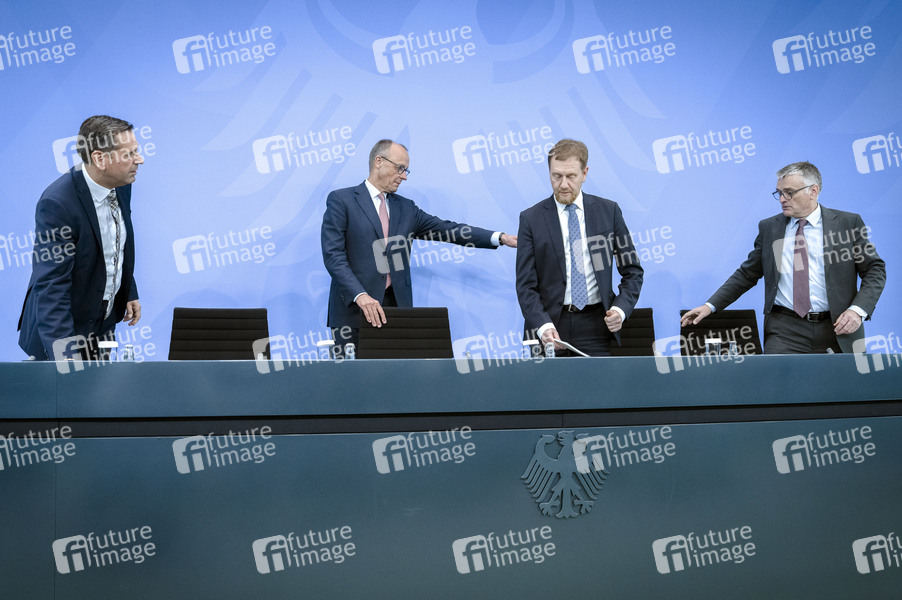 Olaf Lies, Friedrich Merz, Michael Kretschmer und Stefan Kornelius bei der Pressekonferenz zur Konferenz der Regierungschefinnen und Regierungschefs der Länder im Bundesratsgebäude. Berlin, 18.06.2025