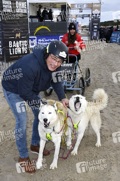 Jan Sosniok und Simone Thomalla beim Kennenlernen der Hunde und beim Renntraining für die Baltic Lights 2022 an der Seebrücke Heringsdorf. Heringsdorf, 04.03.2022