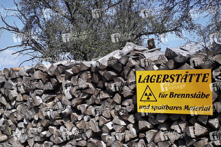 Protest, Schild, Atomkraft, radioaktiv, spaltbares Material, AKW, KKW, Brennstab, atomare Abfälle, atomares Endlager, Endlagerung, Kernbrennstoff, Kernreaktoren, Uran, Energie, Kernenergie, Atomenergie, Atomkraft, Kernkraft, Nuklearenergie, Stom, Stromproduktion, Stromerzeugung, Atomkraftwerk, Kernkraftwerk, Holz, Holzstoss, Brennholz, Wärme, Klafterholz, Feuerholz, Brennholzstapel, Scheitholz, heizen, Heizwert, Feuer