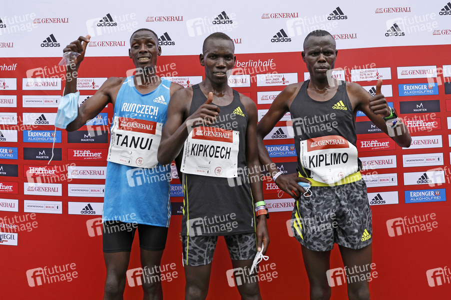 Die Gewinner Moses Tanui (2. Platz), Felix Kipkoech (1. Platz) und Jacob Kiplimo (3. Platz) beim 40. Berliner Halbmarathon 2021. Berlin, 22.08.2021