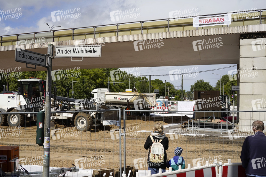 Beginn vom Abriss der maroden Brücke an der Wuhlheide (Oberschöneweide). Die kaputte Brücke soll schnellstmöglich entfernt werden mit dem Ziel, die Freigabe der blockieren Straßenbahntrasse und Wiederherstellung des Fuß- und Radverkehrs zwischen Treskowallee und Edisonstraße möglichst bis zum 30. Mai. Berlin, 23.05.2025