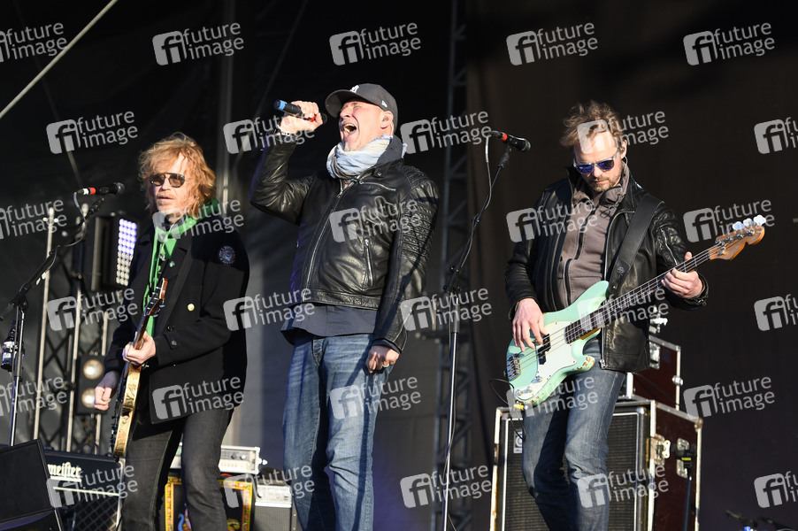 Christof Stein-Schneider, Kai Wingenfelder und Christian Decker von Fury in the Slaughterhouse live beim Autokultur-Konzert auf dem Schützenplatz. Die Besucher verfolgen unter Berücksichtigung klarer Hygiene-Vorschriften während der Corona-Krise den Auftritt aus dem Auto. Hannover, 14.05.2020